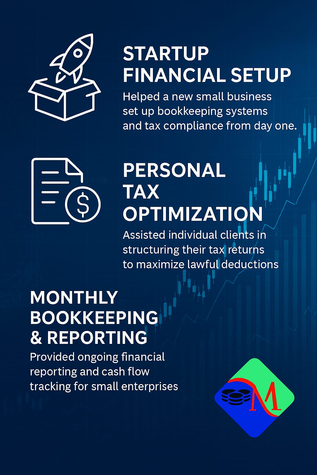 Helped a new small business set up bookkeeping systems and tax compliance from day one. - Personal Tax Optimization