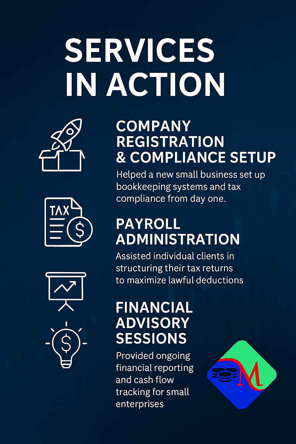 Our mission is to provide accurate, compliant, and insightful accounting and advisory services that empower businesses to grow sustainably and confidently. Our vision is to become your trusted financial partner, offering clarity, strategic insight, and long-term value beyond the numbers.